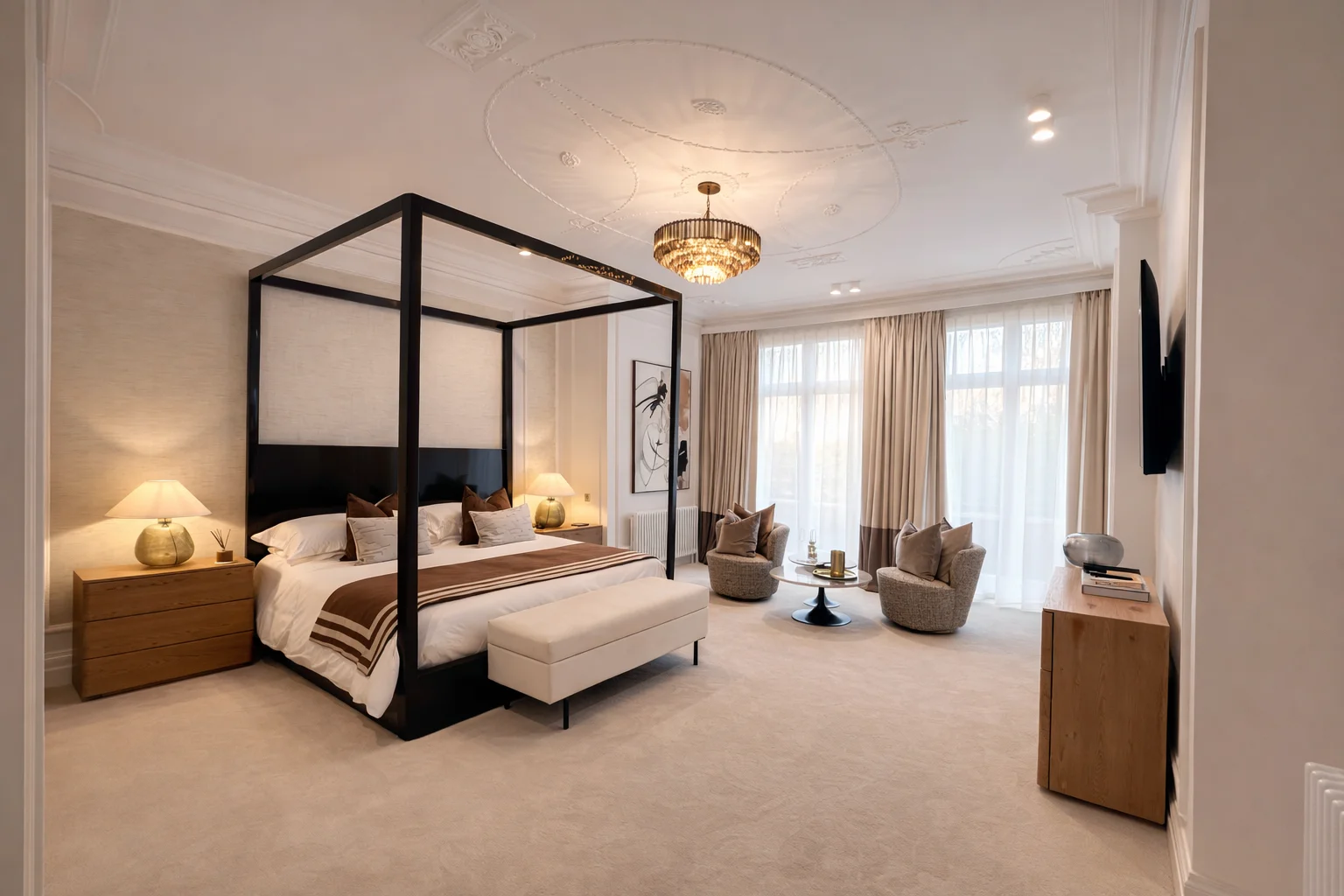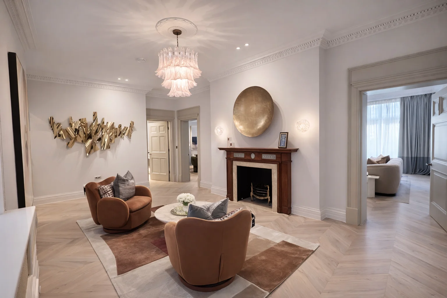 An elegant second-floor apartment set within a striking mansion block overlooking Hyde Park. Fully refurbished to create a refined and contemporary living environment, combining modern design with high-quality finishes throughout — generous proportions, impressive ceiling heights and south-facing balconies.